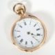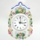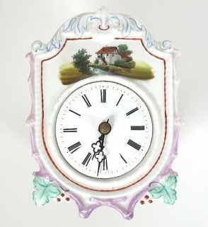 Schwarzwald, Historismus Epoche, Holzgehäuse, reliefiertes und teilpolychromiertes Porzellanschild, oberhalb des Emaillezifferblatts kolorierte Landschaft im Umdruck, gebläute Zeiger, Halbstundenschlag auf Glocke, orig Pendel und Gewichte anbei, Gehäusemaße 22 x 10 x 15,5 cm