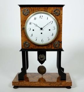 späte Biedermeier-Epoche,, Holzgehäuse, Wurzelnußfurnier, teilweise ebonisiert, würfeliger Korpus auf 4 Beinchen, Plinhe auf 4 Füßchen, Messinglunette, gewölbte Scheibe, Emaillezifferblatt, arabische Indices gebläute Zeiger, 1/4h-Schlag auf Spiralfeder, i d Front Messingappliken, über alles ca. 22 x 30 x 13,5 cm, Werk läuft kurz an, Revisionsklappe erneuert