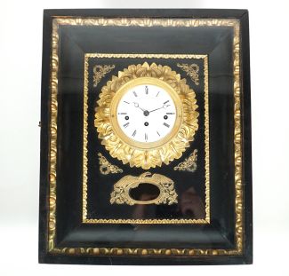 Wien/Böhmen, Anfang 19.Jh., Mstr. Franz Nepomutzki/Hohenfurt, Holzgehäuse, schwarz lackiert, verglaste Fronttür, Bronzelunette u weitere -applikationen, feuervergoldet, ovales Pendelschaufenster mit adlerbekrönter Umfassung, Emaillezifferblatt, römische Indices, gebläute Zeiger, Messingplatinenwerk, Fadenaufhängung, 1/4h-Schlag auf 2 Klangfedern, orig. durchbrochen gearbeitetes Pendel, ca. 44 x 36 x 13 cm, Werk läuft