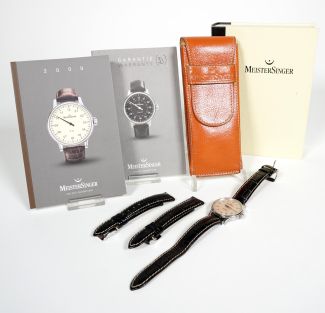 Meistersinger Karelia Edelstahl, Handaufzug, Dm ca. 34 mm, arabische Indices, gebläuter Zeiger, Lederarmband, dazu 2 weitere orig. Ersatzlederarmbänder, Garantiekarte Art.Nr. 328 Ser.Nr. CM301, Werk läuft, orig. Lederetui, Pappschatulle i Buchform