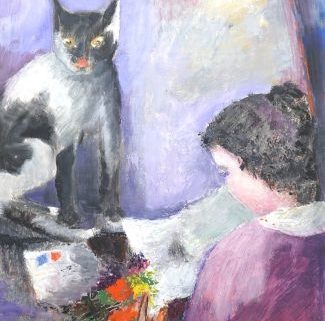 Öl/Holz, Katze u. lesende Frau, li. unten sign., 49,5 x 39,5 cm, HR