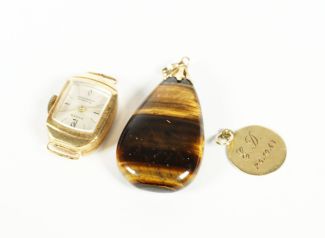 bestehend aus: Damenuhr, Herst Anker, 585er Uhrgehäuse, Handaufzug, 17 jewels, hochrechteckiges Zifferblatt, Goldzeiger, Strich- und arab Indices, 2,5 x 1,5 cm, runder Anhänger mit Eigentümergravur, je MZ, Beschau, zus 3,46gr 585er Gold (ohne Werk mit Glas gewogen), dazu Tigeraugeanhänger mit 333er Goldanstoß, L. 4,3 cm