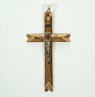 halbplastischer Christi, Dreinageltypus, Ringöse später, über alles 6,5 x 3 cm, ca 2,72gr 585er GG total, tlw kl. Gebrauchsdellen, ein Arm fehlt