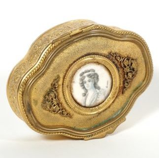 Frankreich, Historismus Epoche, Messing, vergoldet (berieben), vierpassige Grundform, in der Wandung Flachrelief von Rocaillen, im Klappdeckel rundes Medaillon mit Miniaturporträt einer feinen Dame, rechts unten sign Lucas, orig grüne Samtauskleidung, 2,7 x 9 x 7cm