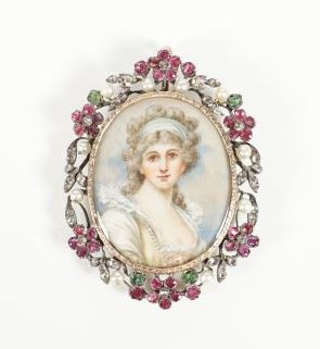 um 1800, hocholvaler Rahmen, Silber, teilweise vergoldet, durchbrochen gearbeitet, Blumen u Blätter im Wechsel aus Rubinen, Rosendiamanten, Perlen u Smaragden, vergoldete Leiste, Miniaturmalereien einer jungen Frau im Stil Angelika Kauffmanns, beidseitig verglast Hakenöse, ca. 15,4 x 4 cm