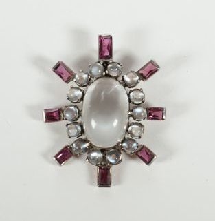sternförmig, Silber, zentral ovaler Mondsteincabochon (im oberen Bereich natürlicher Riß), Entourage von 14 Mondsteinperlchen, außen 8 Amethyste im Karreeschliff, ca. 4,2 x 3,3 cm