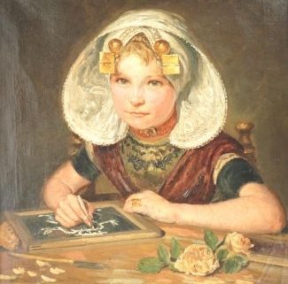 H. M. (?), Portraitist/in, 2. Hälfte 19. Jh., Öl/Lw., Brustbildnis eines zeichnenden jungen Mädchens in niederländischer Tracht am Tisch sitzend, links unten sign., ca. 55 x 50 cm, GoldstuckR, min. best.