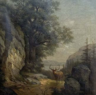 G., Künstler des 19. Jh., Öl/Lw., Zehnender in Gebirgslandschaft, links unten sign., 43 x 30,5 cm, StuckGR der Zeit (dieser min best.)