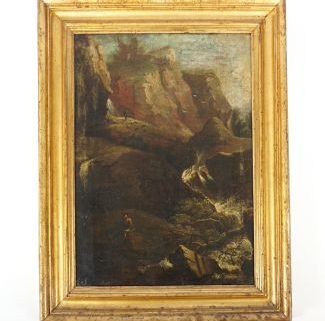 wohl Italienischer Meister, 17./18. Jh., Öl/Lw. alt doubliert, Arkadische Landschaft mit Schafhirte und Fischer, verso Eigentümerbez Alfred Mintzel Berlin und Corradi Meicchiglia (?) sowie Reste von italienischem Ausstellungsetiketts, 55 x 39 cm, Krakelee, teilweise retuschiert, GR (min besch)
