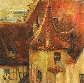 Öl/Lw., Blick über Ronde Lutherse Kerk auf Gracht mit Amsterdamer Panorama-Ausschnitt, li. unten sign., 50 x 70 cm, Krakelee, GStuckR