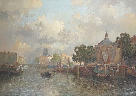 Öl/Lw., Blick über Ronde Lutherse Kerk auf Gracht mit Amsterdamer Panorama-Ausschnitt, li. unten sign., 50 x 70 cm, Krakelee, GStuckR
