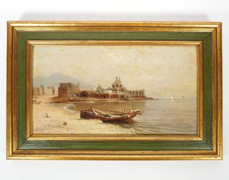 E. o. MONTI, E. (? ), Italienische Schule, 19.Jh., Öl/Holz, Blick über Fischerboote auf Altstadt von Genua, links unten signiert, ca. 18 x 32 cm, HR