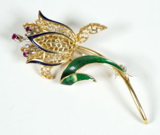 Italien, Form einer Tulpe, tlw emailliert (eine Stelle besch), Blüte Goldgitter, bewegliche Staubblätter in WG, Staubbeutel mit 3 Rubinsplitter, MZ, Beschau, L. 5,5cm, ca 7,49gr 18K WG/GG total