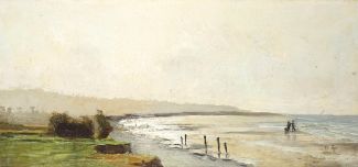 Em., Künstler/in des 19.Jh., Öl/Lw., Fischer an Strand von Villerville, rechts unten sign., bez und dat 1882, Lackrahmen, 21 x 43,5cm