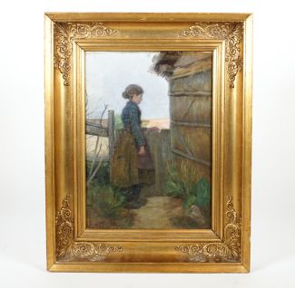 um 1900, Anton Dorph(?), Öl/Holz, Bauernmädchen am Törchen, linsk unten monogr., 33 x 23,5 cm, StuckGR (min best)