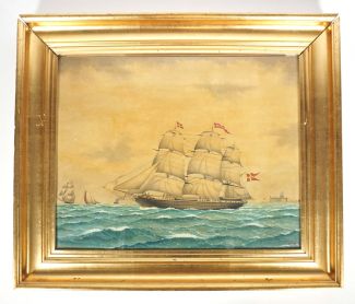 Kapitänsbild, Goauche/Aquarell/Zeichnung, Dreimaster „Diana“ in voller Takelage vor Schloss Kronborg, rechts unten sign., 46,5 x 58 cm, gebräunt, hinter Glas, GR (dieser besch)