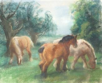 Pastellkreide/Papier, Drei Kaltblüter auf der Weide, unten rechts sign., Ausschnittsmaß 40 x 49 cm, Passepartoutmontage