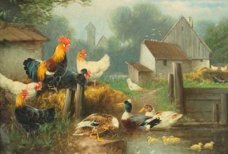 Öl/Lw., Federvieh mit Entenfamilie am Teich, unten links sign und bez., 26,5 x 40 cm, HR