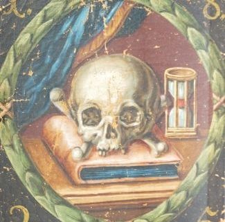 ÖL/Lw., montiert, memento mori, in Lorbeerkranz, in den Ecken datiert 1825, unten rechts Reste von roter Signatur, hinter Glas, Schrägschnittpassepartout, HR, Ausschnittsmaß 44,5 x 38,8 cm, starkes Krakelee, tlw Ausbrüche in Malschicht, obere linke Ecke Loch