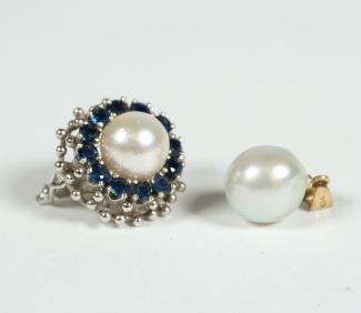 Kettenschloss und Anhänger, runde Form, zentral Perle, gerahmt von Saphiren in Krappenfassung, Sicherheitsbügel, Dm. 1,6 cm, und Perle mit Goldöse, L über alles 1,7 cm, je Beschau, zus ca 7,57gr 585er WG und GG total
