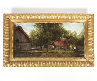 H., Öl/Lw., Bauernhof an Waldlichtung mit Personenstaffage, unten rechts sign und dat 1890, 24,5 x 50,5 cm, StuckGR
