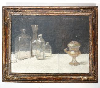 ÖL/Lw., Stillleben mit Karaffe und Flaschen, oben rechts sign und dat 1913, verso Reste Papieretikett „Große Berliner Kunstausstellung 1913“ sowie numm 3129, 51 x 65,5, StuckR, tlw Krakelee