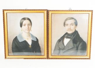 A., Portraitist der Biedermeier-Epoche, Pastelkreide/Papier, Paar Brustbildnisse der Eheleute Karl + Nanette Krieh aus Mainz bzw. Bonn, 1 x links unten signiert u dat 1844, ca. 36,5 x 29,5 cm, 1x rechts oben eingerissen, hG, Goldleiste, je verso orig. Widmung u Bezeichnung