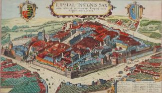 HOGENBERG, Frans (*1535 Mechelen †1590 Köln),Kupferstich, altkoloriert, „Lipsiae insignis Saxoniae urbis et celeberrimi Emporii vera Effigies. Anno M.DC.XVII.“, Gesamtansicht aus der halben Vogelschau von Leipzig, zwei Wappen, unten rechts Legende, Bugfalte, 27 x 45,5 cm, hinter Glas, Schrägschnittpassepartout, GR, leicht gebräunt, min stockfl.