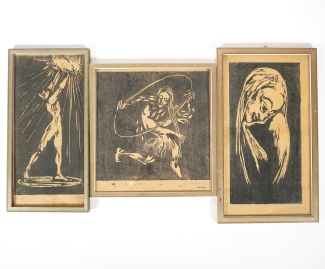 Holzschnitte, Konvolut von 3, Tanzpaar, „Lichtträger“ und Frauenporträt, je unten rechts sign, 1x unten links bez und mittig betitelt, Plattenmaß 23,5 x 24 bzw 30,5 x 15,5 bzw 31 x 16 cm, je hinter Glas, GR (tlw besch), je gebräunt