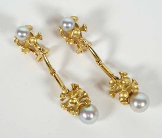 Anstoß koralleförmige Zapfen mit Perle, endig entspr, mittig Steg, L. 5 cm, Beschau, zus ca 13,31gr 750er GG total