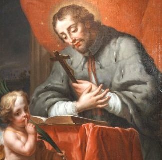 Italienischer Meister, 17./18.Jh., Öl/Lw doubliert, Hlg. Johannes von Nepomuk, links unten Putto mit Märtyrerpalme, ca. 98 x 79 cm, Neuer Keilrahmen, Lw an mehreren Stellen retuschiert, ebonisierter Holzrahmen der Zeit, ca. 107,5 x 87,5 cm