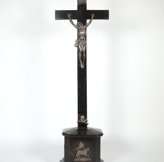 Biedermeier Epoche, ebonisiertes Holz, oktogonaler getreppter Stand, entspr. Sockel, dort 3 Silberbleche, Cherubim und Lamm Gottes, entspr Kreuz, Korpus Christi, INRI-Schriftzug und Totenkopf, 70 x 20,5 cm