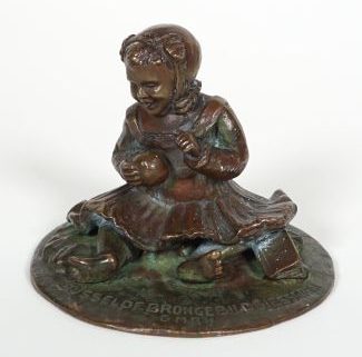 in der Art einer Wiener Bronze, patiniert, Ende 19. Jh., spielendes Mädchen auf runder Platte geschraubt, dort bez. Düsseldf Bronce Bild Giesserei GmbH, ca. 7 x 8,5 cm