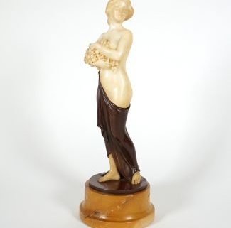 Allegorie des Herbstes, weiblicher Halbakt Trauben haltend, Alabaster u. Bronze, patiniert, Mamorsockel, auf Plinthe sign. „Ricec“ und Gießereistempel Schumacher, H ca. 35,8 cm, Alabaster mit Gebrauchspatina