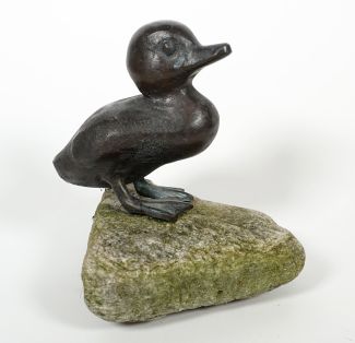 Entenküken, Kupfer-Galvano-Plastik, patiniert, auf Naturstein, ca. 15 x 16,5 x 15 cm