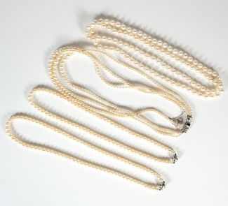 Konvolut von 4, 2x 750er WG-Kugelschließe mit Saphirsplittern, L. 45 und 48 cm und 1x 3strängig mit 750er WG-Schleifenschließe, diese mit Saphir und Diamanten besetzt, L. 50 cm, 2x MZ und Beschau, 1x getestet