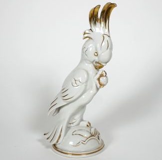 Porzellanmalerei August Rohloff/Münster, Kakadu auf halbkugeligem Sockel, Art Deco Epoche, goldsilhouettiert, H 27 cm, Stempelmarke über Glasur
