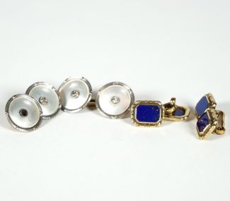 Konvolut von 2, rechteckig mit Lapislazuliplättchen bzw rund mit Perlmuttplättchen und zentralem Altschliffdiamanten (einer fehlt), à ca 0,075ct, je Beschau, zus ca 15,72gr 585er GG total