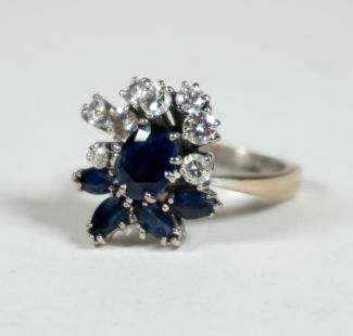 2fach gekantete Schiene, zentral Saphir in Ovalschliff sowie 4 weitere in Navetteschliff, 8 in Größe variierende Brillanten, à max 0,1 ct, je Krappenfassung, Beschau, ca 7,07gr 750er WG total, Ringgröße 54