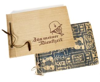1933-45, 2 Fotoalben, „Meine Arbeitsdienstzeit vom 1.4-26.9.1936 Arbeitsmann Peters Flügelmann v. 1/25“, 23 s/w-Fotos aus Arbeitsalltag des RAD; „Aus meiner Dienstzeit Kurt Schänzer“, 1936-40er-Jahre, ca. 76 s/w-Fotos, u.a. Flugzeuge, Autos, Schiffe, marschierende Soldaten, je ca. 19 x 27 cm