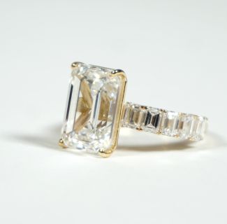 zentral synthetischer Diamant à 10,09ct, E, VS2, Smaragdschliff, Krappenfassung, flankiert von 10 Diamanten à ca 0,2ct, Beschau, ca 5,55gr 585er GG total, Ringgröße 56, dazu IGI-Report vom zentralen Diamanten