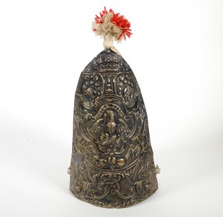 Preussen, 1871-1918, Grenadiermütze M 1894 für Mannschaften, geprägtes, versilbertes Blech (stärker berieben), seitlich Knöpfe 91 (1897 f.), orig. roter Filzstoff, weiße Borten, rot-weißes Einsteckfeldtzeichen, über alles ca. 35 x 20 x 19 cm, ohne Schuppenkette, alterbedingte Gebrauchsspuren, orig. Schweißleder hinten gelöst