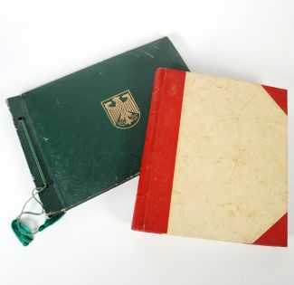 Konvolut von 2, Marine/Bundeswehr 1950er/60er-Jahre, bestehend aus: Album Marine, ca. 89 s/w-Fotos meist mit schriftlicher Einordnung, u.a. Rekrutenzeit Glückstadt 16.IV.-30.7.1958, Crew 4/58, weitere Fotos während des Dienstes u bei Übungen, an Land u auch auf Schiff, ca. 25 x 22 cm; Album Heer, Dienst wohl in Hessen, ca. 91 s/w-Fotos, u.a. Dienst, Fahrzeuge, u.a. Jeeps, Panzer, Fahrzeigverladung, goldgepräger Bundesadler auf Albumtittel, ca. 22,5 x 31 cm