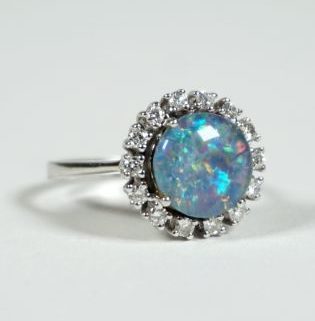 zentral Opaltriplette, umlaufend Brillanten, à ca 0,03ct, je Krappenfassung, Beschau, ca 4,51gr 585er WG total, Ringgröße 56