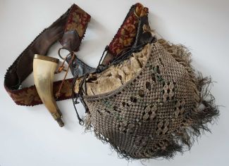 Pulverhorn, 19.Jh., Leder, teilweise geprägt Stoff, Fellbesatz mit Rehzehen, Textilüberwurf und -tragegurt, dieser mit floraler Stickerei, stärkere Gebrauchsspuren, 1 Knopf fehlt, über alles ca. 80 x 30 cm, mit Pulverhorn, Messingbeschläge, ca. 8 x 21 x 3,5 cm