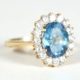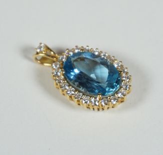 zentral Aquamarin (behandelt) in Ovalform, à ca 3ct, umlaufend Brillantsplitter à ca 0,05ct, je Krappenfassung, Öse mit Brillantsplitter, Beschau, ca 4,27gr 750er GG total, über alles 2,5 x 1,5 cm