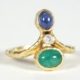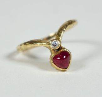 verlaufende Schiene im Hammerschlagdekor, zentral Rubincabochon in Herzform, oberhalb Brillantsplitter, je in Zargenfassung, MZ, Beschau, ca 5,55gr 750er GG total, Ringgröße 58/59