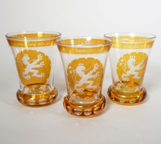 Satz von 3, Sudetenland, 1.10.1938, farbloses Glas, tlw. bernsteinfarben lasiert, in der Lippe Parole u. Dat., sowie in der Wandung steigender Löwe, H 11 cm