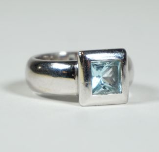 breite Schiene, zentral Aquamarin in Carreeschliff in Zargenfassung, MZ, Beschau, ca 13,28gr 750er WG total, Ringgröße 52