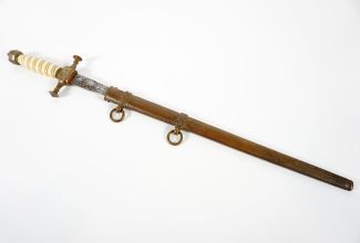 1871-1918, Dolch, Marine, Beingriff, Wicklung fehlt, Parierstange mit Ankersymbol, Kaiserkrone als Abschluß, Klinge (Flugrost) mit geätztem Marinedekor „Festen Muths in Sturm und Gefahr“, Scheide, Kupfer, mit Blitzdekor, 2 Trageringe, Ringbänder mit Taudekor, L über alles ca. 48,5 cm, Gebrauchsspuren, 1 Seite der Parierstange etwas verbogen